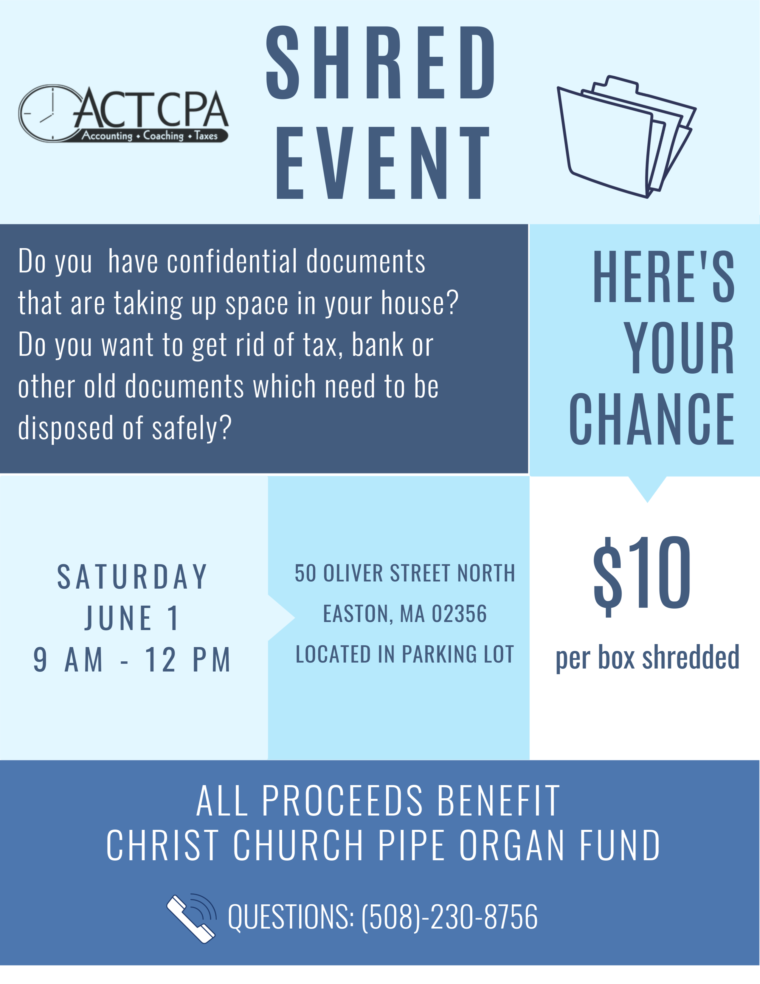 Come out to our ACT CPA Shred Event at our office in Easton this Saturday! All proceeds benefit the Christ Church Pipe Organ Fund. We can take cash, credit or check.